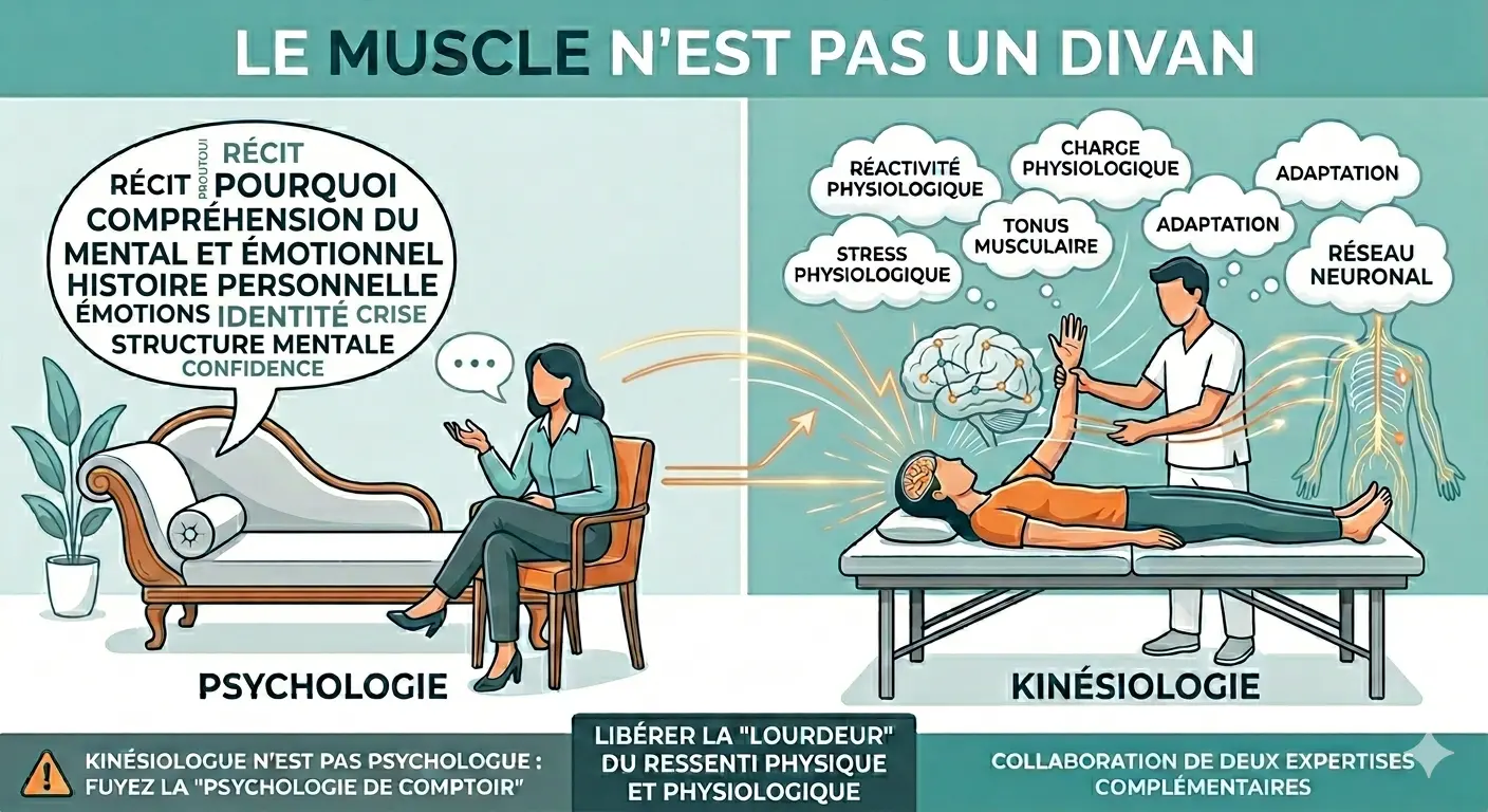 • Le kinésiologue, lui, ne travaille pas sur la narration. Son rôle n’est pas d’analyser le « pourquoi » d’un mal-être, mais de détecter des variations de tonus musculaire qui indiquent une surcharge de stress dans l’organisme, ici et maintenant.